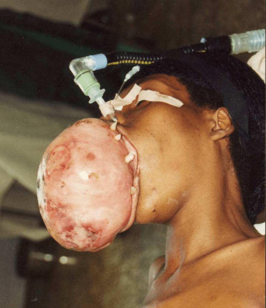 She refused to go. It was obvious that if nothing was done she’d soon die. We had poor X-ray facilities. I was fortunate to have with me, if only for a few weeks, a visiting Australian anaesthetic trainee. I believed it was a case of maxillary monostotic fibrous dysplasia. We set up for a tracheotomy in case it became necessary, but planned first to do an awake blind intubation under local anaesthetic. After appropriate anti-anxiety medication, local anaesthetic sprayed up her nose and through the slit in her mouth and then injecting LA into the trachea, we were able to intubate her blindly; we listened for her breathing coming up the tube before gently pushing the endotracheal tube into the trachea. She was then put to sleep. I was able to keep her orbital margin intact and her vision was not impaired. I was able to preserve enough skin from her palate to primarily close the defect after the tumour wa removed. Because of absence the of her maxilla, she had a very sunken hemi-face on the right. Maybe you would consider plastic surgery to get a more cosmetic result, but she was able to eat normally and was very happy with the result. In the immediate postoperative photo you can see how her tongue had been displaced. Initially even gravity didn’t make it fall into place. Time did!
