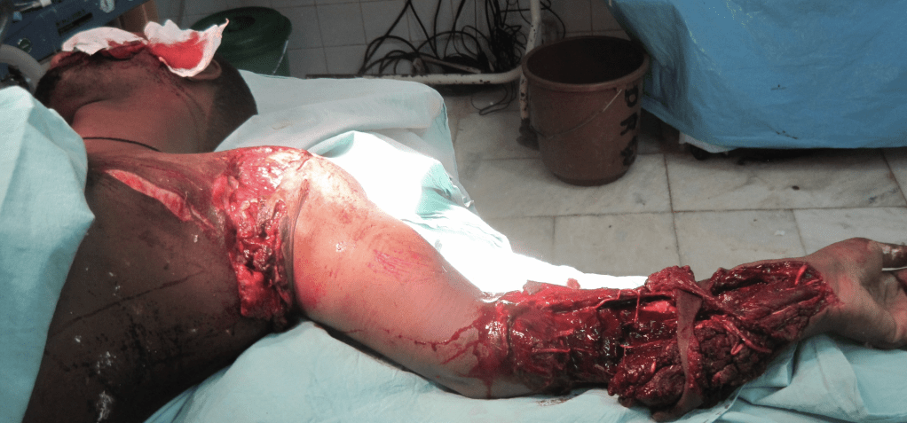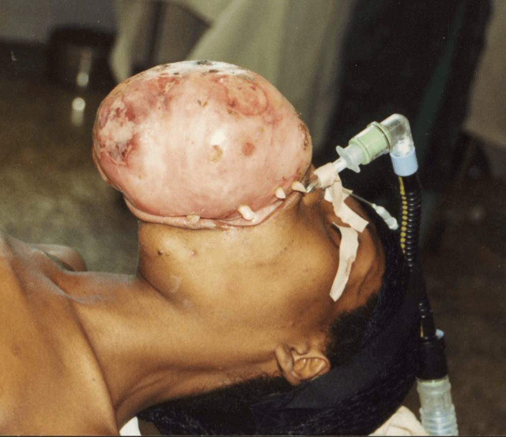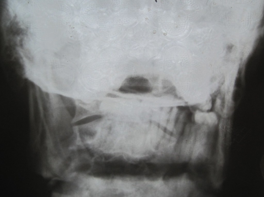 A compound fractured mandible from a machete injury.